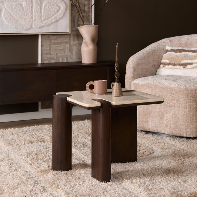 Bijzettafel Maeve van Starfurn combineert een strak marmeren blad met stevige poten van bruin mangohout. Een elegant, modern ontwerp met natuurlijke luxe. Lees meer.
