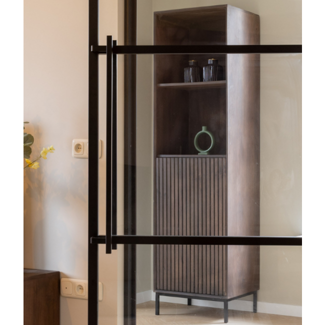 Boekenkast ‘Madison’ is gemaakt van mangohout. Het metalen frame is afgewerkt met een zwarte lak. Dit model is voorzien van één deur en 2 openvakken. De deur is voorzien van een verticaal lattenpatroon en is afgewerkt met een walnoot finish.