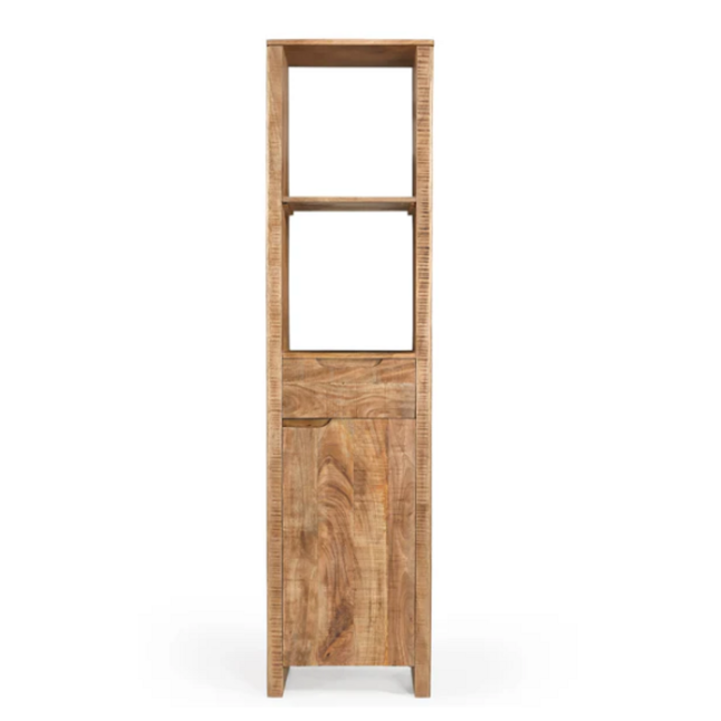 Boekenkast Sophie van massief mangohout met open vakken en deur. Smal en hoog design van 200 cm, ideaal voor boeken en opbergruimte in elk interieur. Lees meer.