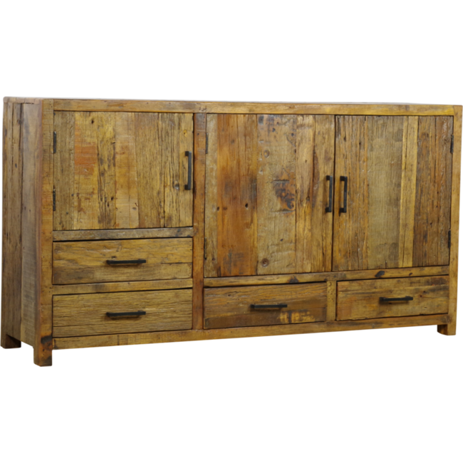 Stoer Brent dressoir van gerecycled hout (160 cm). Uniek karakter, royale opbergruimte en robuuste uitstraling. Perfect voor industrieel en landelijk interieur. Lees meer.