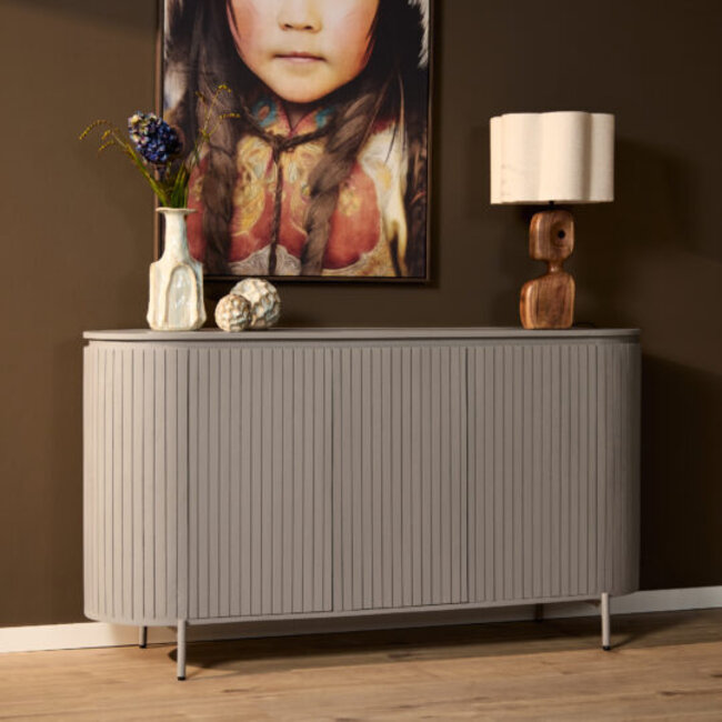 Het Dressoir Solana 165 cm Taupe van Starfurn combineert modern design met praktisch gebruiksgemak. Het verfijnde verticale lattenpatroon en de afgeronde vormen geven dit meubel een eigentijdse en luxe uitstraling die in vrijwel elk interieur tot zijn recht komt.
