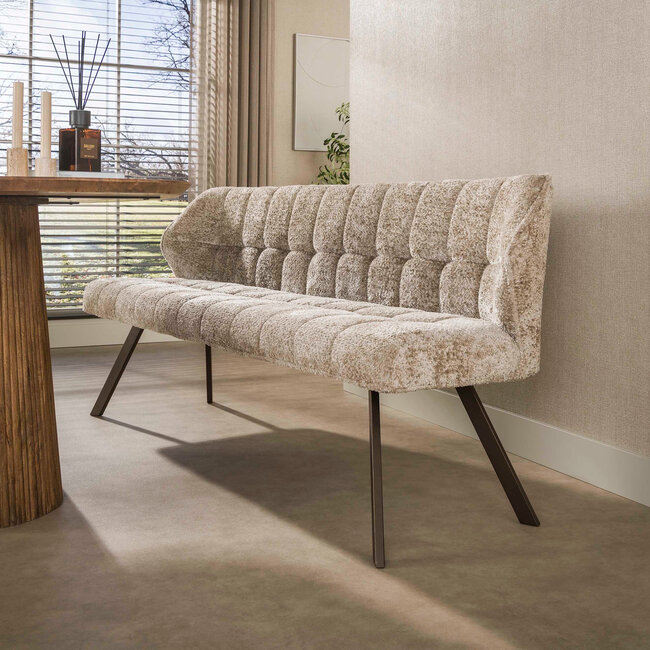 Eetkamerbank Raster 180 is uitgevoerd met decoratieve stiknaden in een strak rasterpatroon. Dit geeft de bank een moderne uitstraling met subtiele details. De licht zandkleurige Alure-stof zorgt voor een frisse, rustige basis in je interieur en laat zich perfect combineren met houttinten, zwart staal of warme bruintinten.