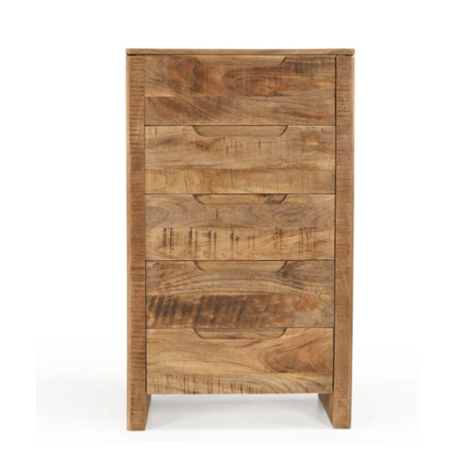 De Ladekast Sophie met 5 laden is een slanke en hoge opbergkast die functionaliteit en natuurlijke uitstraling perfect combineert. Deze ladekast is vervaardigd uit massief mangohout, wat zorgt voor een warme kleur, een robuuste uitstraling en een uniek karakter dankzij de zichtbare houtnerf.
