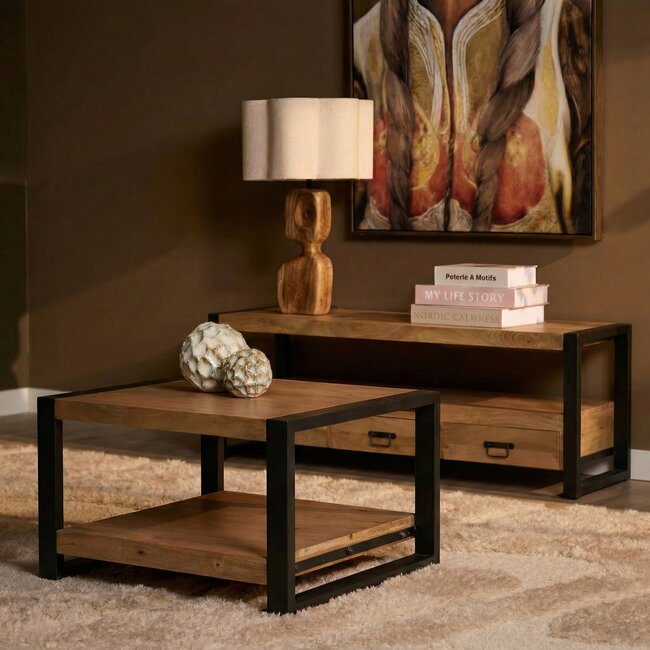 De Salontafel Britt is uitgevoerd in massief mangohout en vormt samen met het zwart metalen frame een krachtig industrieel geheel. De lichte houtfinish benadrukt de natuurlijke houtnerf en geeft de tafel een warme, sfeervolle uitstraling die past in diverse interieurstijlen.