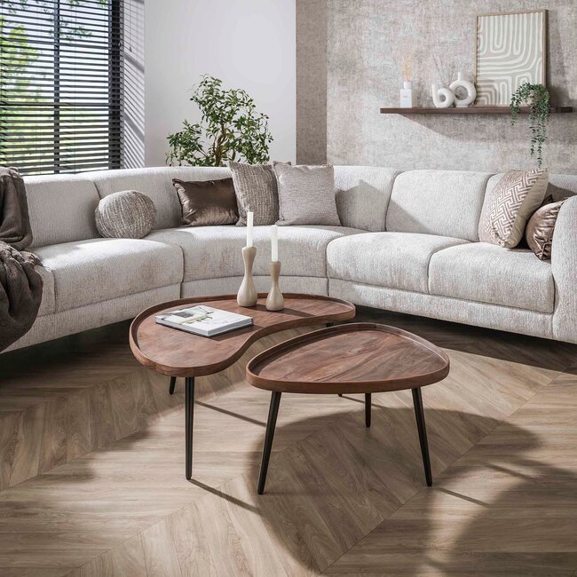 De Salontafel Carve organisch – set van 2 van WoonStijl is een echte blikvanger in de woonkamer. De tafels zijn vervaardigd uit massief acaciahout en afgewerkt met een warme drift brown finish die het natuurlijke houtpatroon prachtig laat uitkomen. Het gepoedercoate metalen onderstel in een bijpassende bronzen kleur geeft de set een stoer en modern accent.