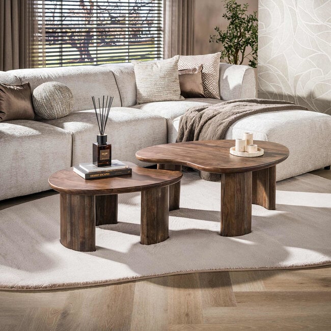 Wat deze set direct bijzonder maakt, zijn de organisch gevormde bladen. De asymmetrische, vloeiende vormen geven de tafels een zachte en eigentijdse uitstraling. Daardoor oogt de set luchtig, stijlvol en net even anders dan een standaard salontafel.