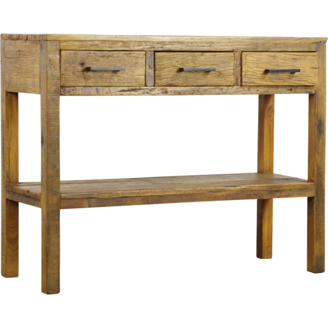 Robuuste sidetable Brent 110 cm van gerecycled hout. Uniek karakter, drie lades en een warme industriële uitstraling. Verkrijgbaar bij Houten Meubel Outlet. Lees meer.