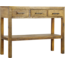 De tafel is voorzien van drie ruime lades, ideaal voor het opbergen van sleutels, papieren of andere dagelijkse spullen. Het open onderblad biedt extra ruimte voor manden, boeken of decoratieve accessoires. De zwarte metalen handgrepen zorgen voor een stoer accent en vormen een mooi contrast met het warme hout.