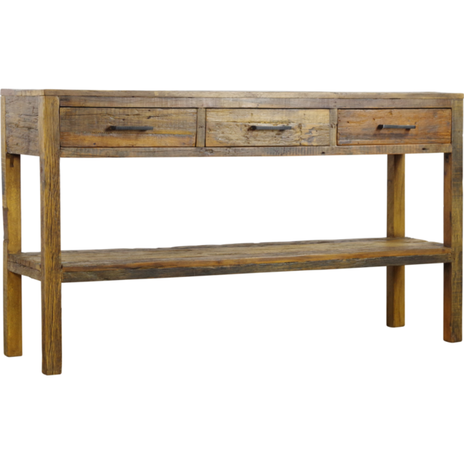 De Sidetable Brent 150 cm is een royale, robuuste tafel van gerecycled hout. Dankzij de drie lades en het open onderblad combineert dit meubel praktische opbergruimte met een krachtige, natuurlijke uitstraling. Lees meer.