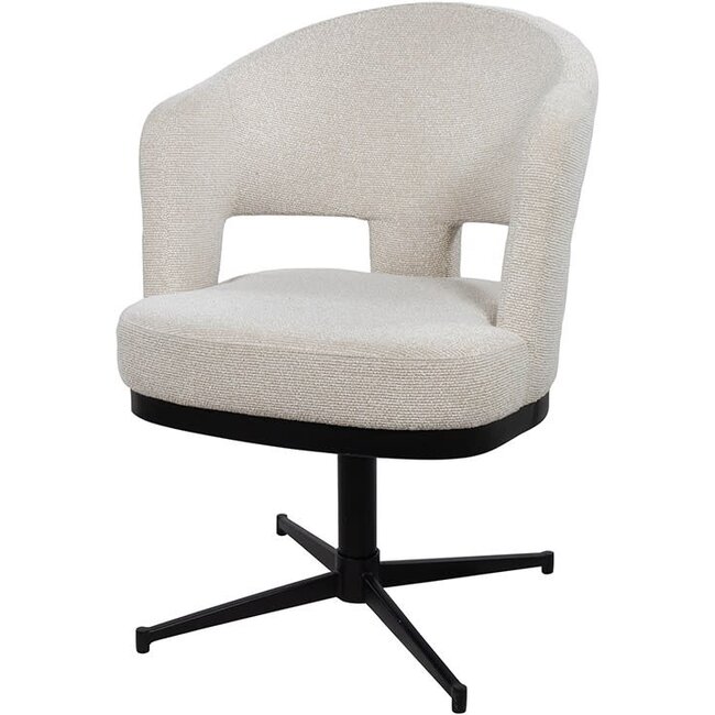 De Eetkamerstoel Friso met draaipoot 360 is een comfortabele en elegante armstoel met een modern, uitnodigend design. De ronde vormen, open details in de rug en de zachte bekleding zorgen voor een luchtige en luxe uitstraling. Dankzij de 360 graden draaifunctie biedt deze stoel extra gebruiksgemak aan de eettafel en is hij ook zeer geschikt voor een werkhoek of stijlvolle zithoek.