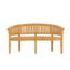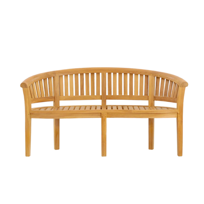 Organische teakhouten bananenbank voor buiten. Comfortabele tuinbank met rugleuning van 150 x 60 x 90 cm. Natuurlijke houtwerking hoort bij teak. Lees meer.
