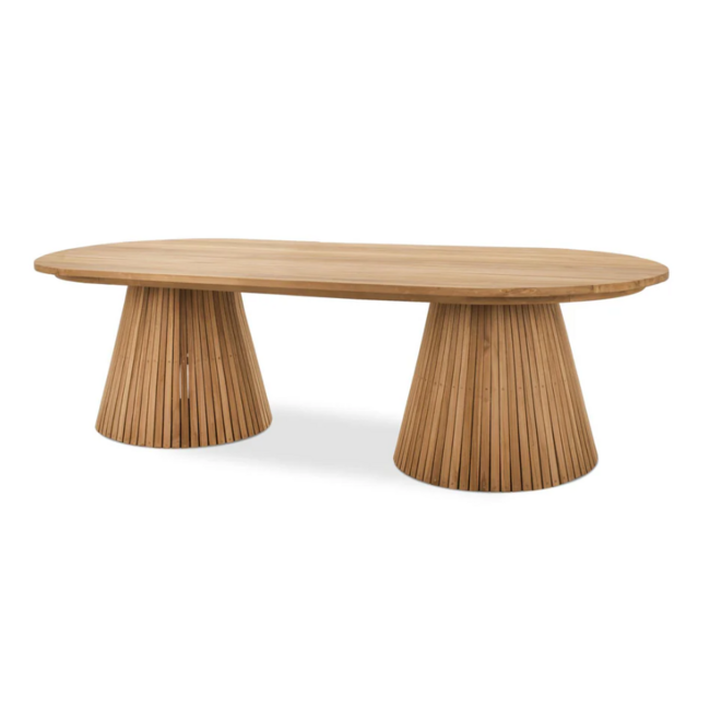 Elegante ovale tuintafel Mirai 240 van duurzaam teak hout met moderne conische poten. Perfect voor tuin en terras. Lees meer.