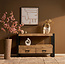 Tv meubel Britt 100 cm is uitgevoerd in mangohout met een lichte finish, waardoor de natuurlijke houtnerf en warme kleurtinten mooi tot hun recht komen. Het meubel wordt versterkt door een zwart gelakt metalen frame, wat zorgt voor een robuuste en industriële uitstraling die past in moderne en eigentijdse interieurs.