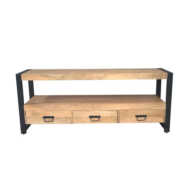 Tv meubel Britt 150 cm is uitgevoerd in massief mangohout met een lichte finish, waardoor de natuurlijke houtstructuur en warme kleurtinten mooi zichtbaar blijven. Het meubel heeft een robuuste uitstraling dankzij het zwart gelakte metalen frame en past perfect binnen een industrieel, modern of landelijk interieur.