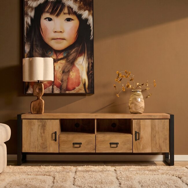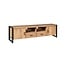 Het zwarte metalen frame en de metalen handgrepen zijn afgewerkt met een zwarte lak. Deze combinatie van hout en metaal geeft het tv-meubel een stoere industriële look die perfect past binnen moderne, industriële en landelijke interieurs.
