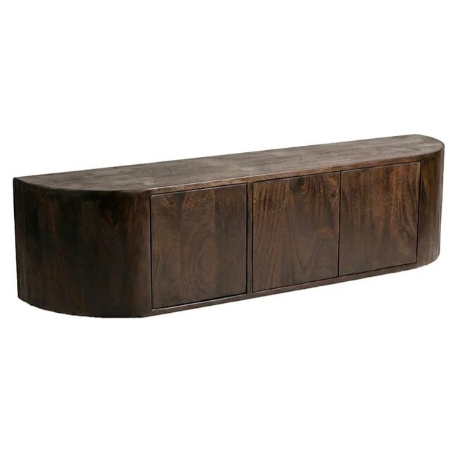 Tv-meubel Saya 160 cm in Espresso mangohout straalt luxe en warmte uit. De rijke, donkere houtkleur geeft het meubel een krachtige uitstraling, terwijl de afgeronde zijkanten zorgen voor een zachte en moderne balans.