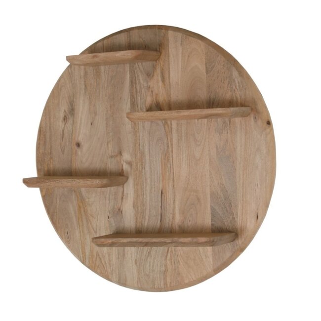 Met een diameter van 75 cm biedt dit wandrek voldoende ruimte om jouw favoriete woonaccessoires mooi te presenteren. De speels geplaatste legplanken geven het ontwerp een dynamisch effect en maken het mogelijk om items op verschillende hoogtes neer te zetten. Perfect voor kleine planten, fotolijstjes, kaarsen of andere decoratieve objecten.