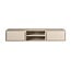 Het meubel is vervaardigd van massief mangohout en voorzien van een lichte zandkleurige afwerking. De twee greeploze lades en twee open vakken bieden ruimte aan mediabenodigdheden zonder dat het ontwerp zijn minimalistische uitstraling verliest.